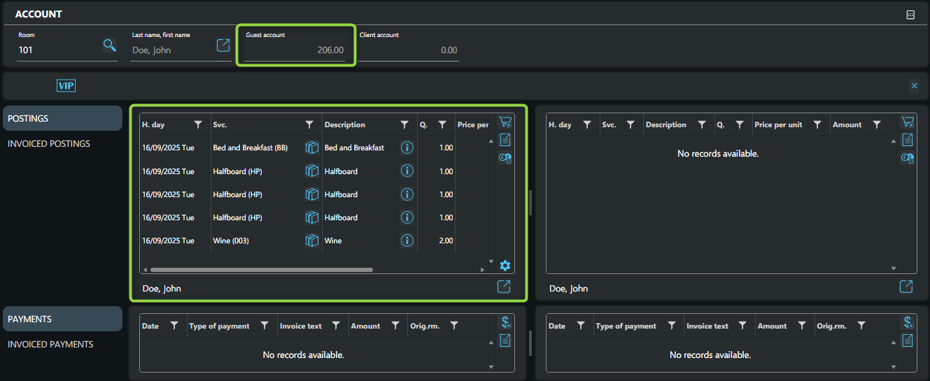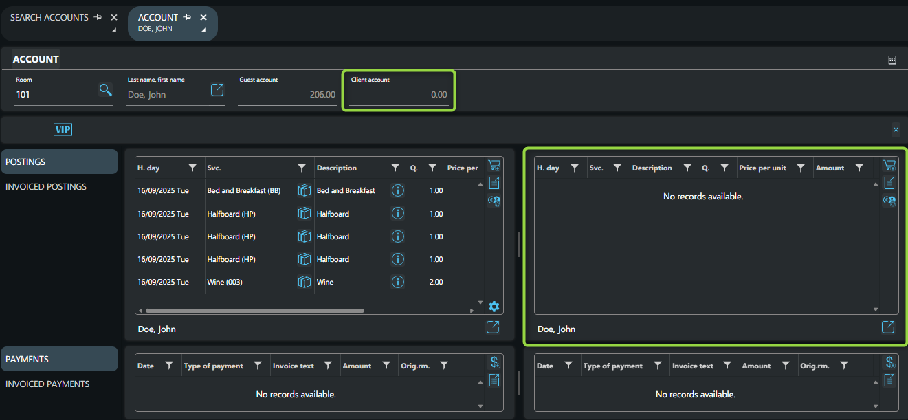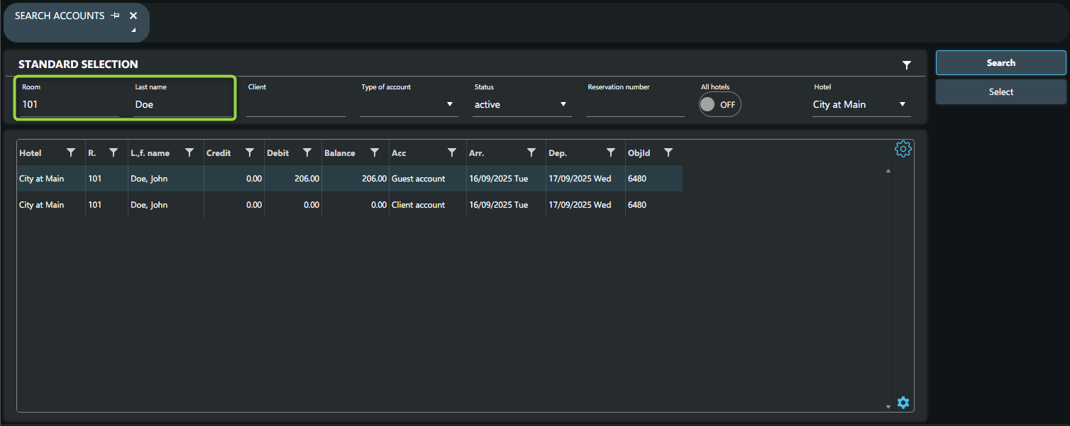 Guest and Client accounts are created automatically during check-in for each room. They are used to manage the charges incurred during the guest’s stay.
