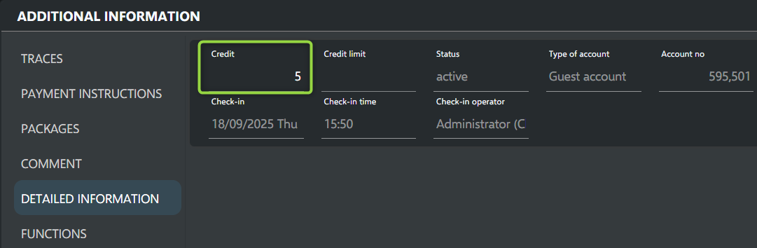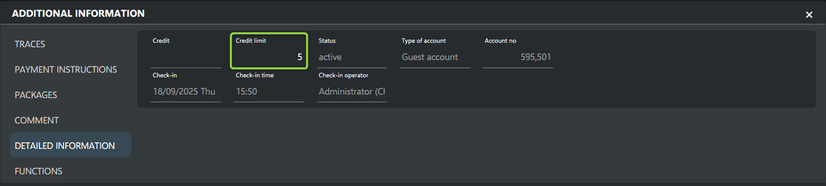 The “Credit” field is used in various F&B interfaces, to define a limit for charges posted via the restaurant POS to a guest’s account. If a charge would cause the account balance to exceed this limit, the posting will be declined.