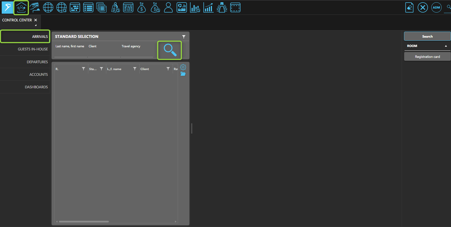 In the Arrivals Tab, click the Search-button to see all guests arriving, or search by the guest's name, client, or travel agency.