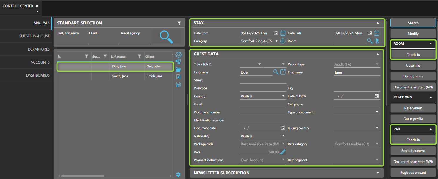You can check in guests using different layouts, such as the Room rack, Reservation, Rooming list, or Control Center. The following steps outline how to check in guests and rooms using the Control Center.