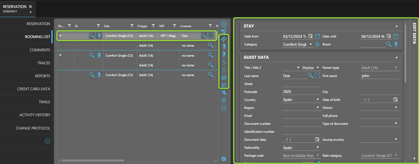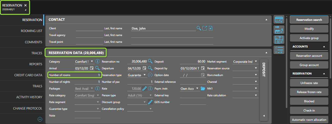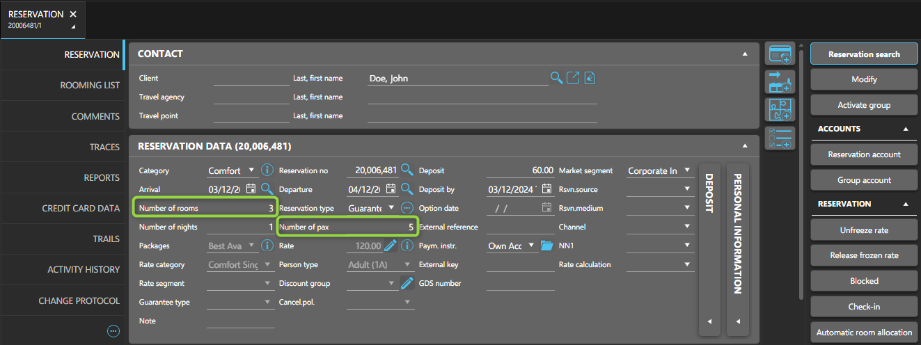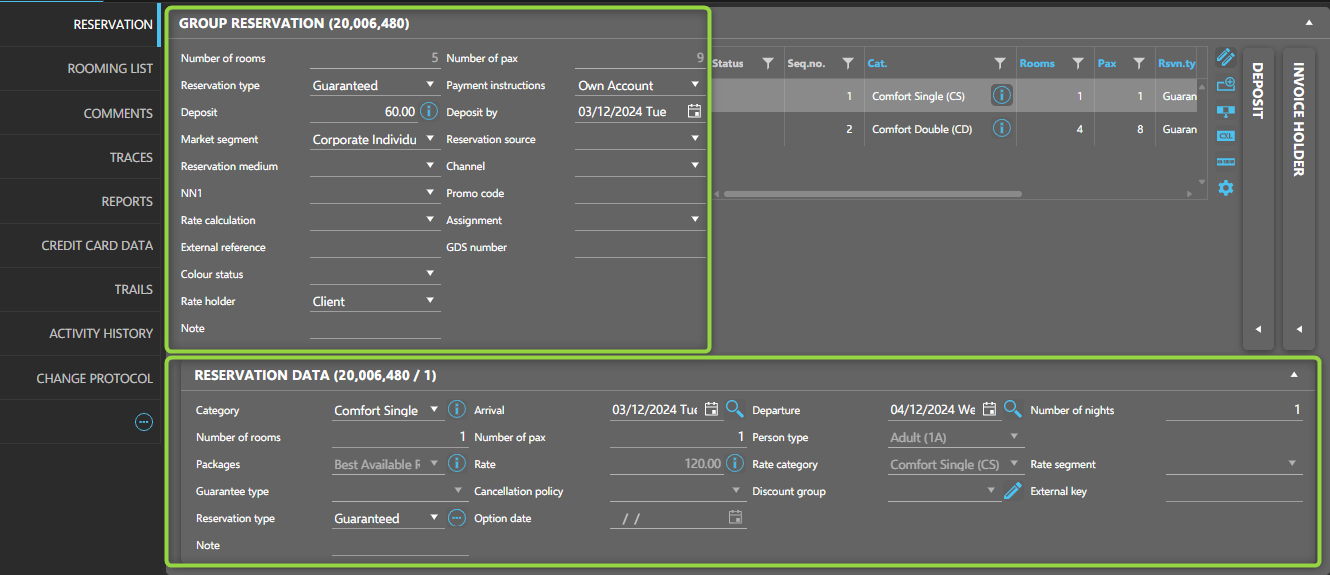 - Enter key details (e.g., stay dates, room category) in the main reservation data.